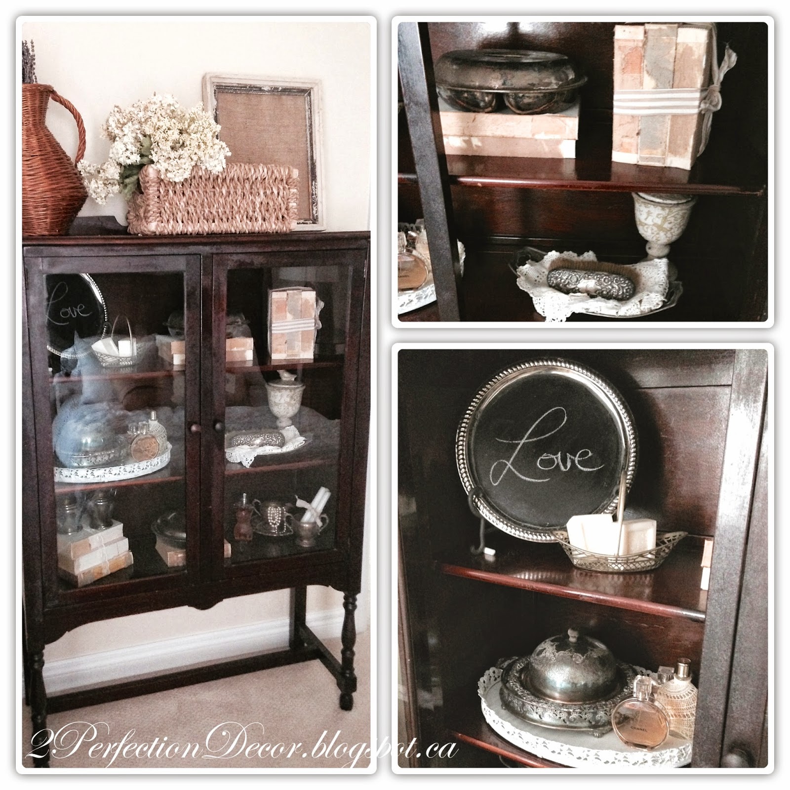 I decorated this antique cabinet that my aunt gave me with antique silverware, vintage books and pretty perfume bottles. If you missed my cabinet Vignette reveal you can see it HERE.