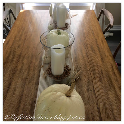 I kept up with the white pumpkin theme.. this time it was 3 large white ones.. First I started with a neutral ticking stripe table runner.. then to keep things from looking too basic and straight, I layered in some dried wheat grass..I laid dried grass under each of the larger pumpkins..and then added some cute little small ones to mix things up a bit..